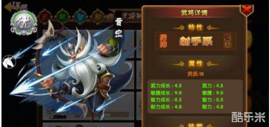 黄忠是一个18资质的后排射手系武将,在技能方面的表现上,