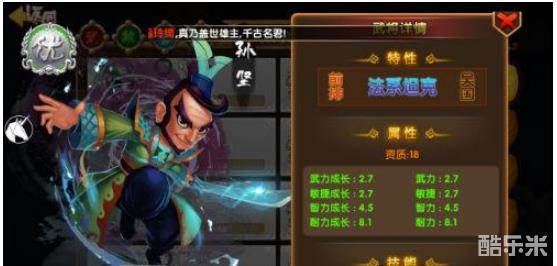 孙坚是一个18资质的前排法系坦克型武将,在技能方面上,