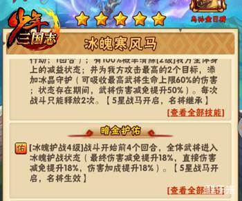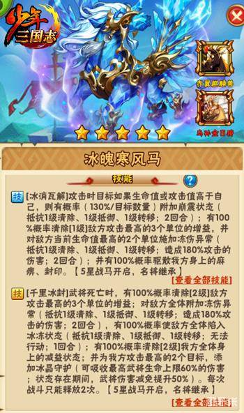 暗金战马“冰魄寒风马”拥有强力技能“冰消瓦解”,可在攻击时高概率对敌方武将附加:崩震、冻伤异常等负面BUFF,并清除敌方主力武将的若干增益效果,多重控制的施加可有效扰乱敌方的输出节奏。