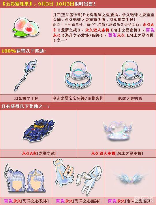9月3日-10月3日期间,五彩蜜珠果甜蜜来袭,打开后必得泡沫之夏戒指、永久泡沫之夏宝宝头饰、永久泡沫之夏宠物头饰、羽念初尘手杖!除以上三种道具外,每个礼包随机获得永久极品奖励:永久A车【龙鳞之战】、永久双人座椅【泡沫之夏座椅】、首发永久【海洋之心发饰/服饰】、首发永久【泡沫之夏羽翼】之一!