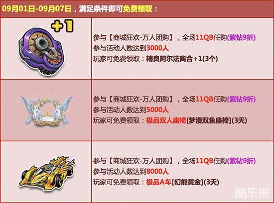 最后编辑于7年前9月1日-9月7日期间,开学精品团购活动上线!在【商城狂欢-万人团购】活动中,全场所有商品11Q币任购(紫钻更有9折优惠)!当参与玩家达到一定人数时,还可免费领取极品道具5喷A车【幻能黄金】、极品双人座椅【梦漫双鱼座椅】哦!