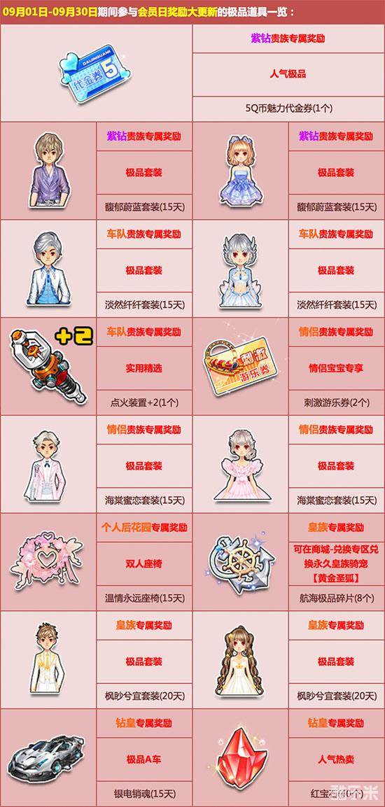 新学期来临,每月1日为飞车【会员日】,魅力达人-特权感恩礼将每月1号定期更新!9月1日-9月30日,5Q币魅力代金券、极品双人【温情永远座椅】、极品套装【枫眇兮宜套装】等豪华奖励免费尊享,极品轻松领!不再是梦!
