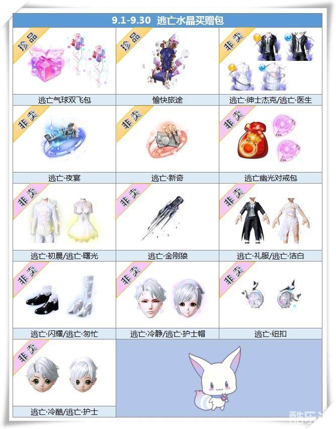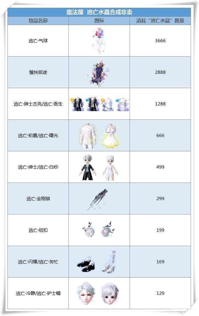 9.1起,逃亡水晶可在魔法屋合成!!不仅可以合成逃亡系列服饰,而且双飞浮云!!双人座椅!!双形态动作套!!也能合成哦!!抽不到,又想要,就去合成吧!!最低套装合成仅需666哦~~