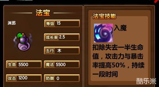 渊邪法宝技能说明:扣除失去一半生命值,攻击力与暴击率提高50%,持续一段时间。