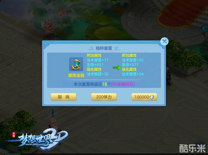 若是少侠在一件装备上误使用了精粹石,或是打造出特效更好的装备,需要取出原来的精粹石,梦想大陆可以帮你实现。装备精粹是可以消耗体力或银两重置的,重置之后,装备会回到精粹前的属性,并返还对应消耗精粹石。不只装备精粹可以重置,帮派个人心法、坐骑技能、精灵潜力皆可重置,如此人性化的设定,实在是给粗心的少侠赠送了一剂后悔药呢!