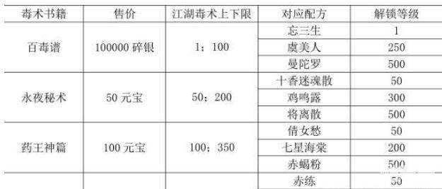 毒药配方需要将对应的毒药书籍研读到一定等级才能解锁,游戏当中一共四本毒药书籍,这四本书籍黑商将会随机出售,唐门之乱剧情中将会赠送玩家一本百毒谱。
