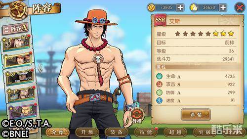 在游戏中,艾斯是可作为前排的SSR角色,攻击属性与防御属性十分出色。艾斯的技能招式忠实还原动画,动态效果也十分震撼。培养前期,玩家可以体验主动技萤火·火达摩、火拳、镜火焰,终结技十字火以及奥义技大炎戒·炎帝。40级时可开启天赋技燃烧果实以及终结技炎戒·火柱,50级时将开启天赋技兄弟情深,与路飞同时上阵将提升艾斯的攻击力与防御力,非常值得期待。