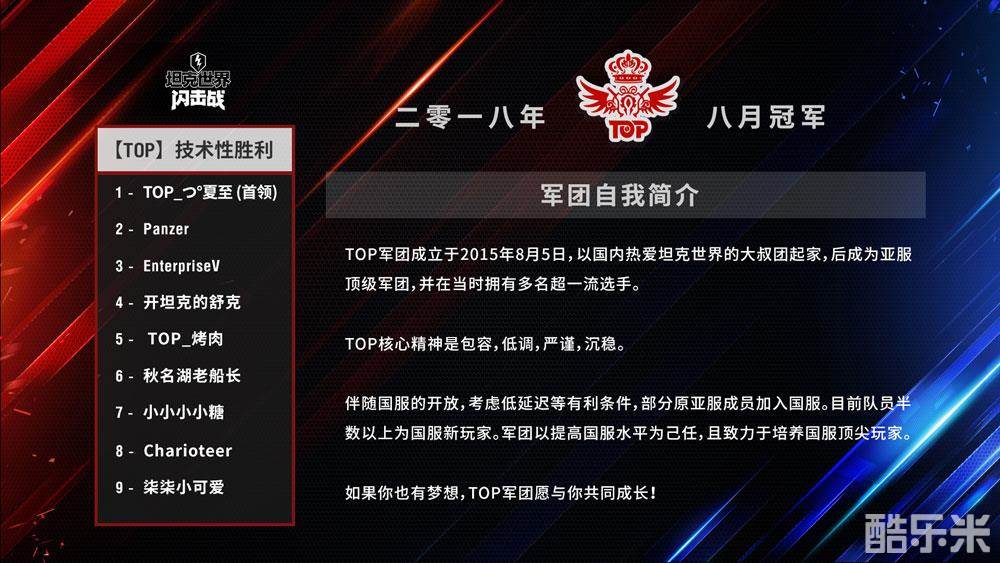 作为国服旋风赛季的揭幕赛事,八月冠军赛备受玩家们关注,此次赛事针对Ⅶ级和Ⅷ级战车举行,赛事规则与旋风杯国服线上冠军赛完全一致,经过数日的激烈厮杀,TOP军队荣耀登顶,这支成立于15年的战队,在加入国服后自然保持了超一流的水准,更带动了国服玩家整体技战术水平的提升。ICFC、MVP、-ELN-三支战队分获亚军、季军和殿军,也都有着极为不俗的表现。