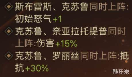 武将组合方面,斯布雷斯的初始怒气+1 奈亚拉托提普的伤害加成与罗丽丝的抵抗加成都给克苏鲁带来了更多的搭配选择和侧重点。缘分实力:☆☆☆☆☆