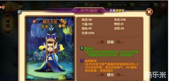 镇元大仙是一个SSS级品质的神将,在技能方面上,普通攻击可以提高自身的闪避能力,多达50%的闪避提升可以有效的加强镇元大仙自身的生存能力,实用性很不错。主动技能上,可以给敌方怒气最高单体带来一定伤害,附带清空怒气的效果,大幅影响敌人单体的技能释放,相当给力。后续还附带概率眩晕的效果,还能够对敌人单体产生一定控制能力,虽然是概率性的,但是总比没有好。
