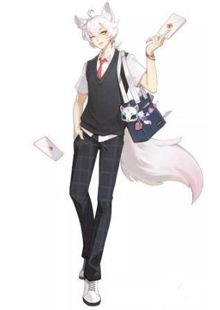 银色的短发、毛茸茸的狐耳与狐尾,招人喜爱。深蓝色高中生校园服饰,简约大气,同时也侧面展现妖狐颀长的身姿,帅气十足!
