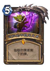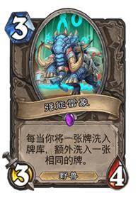 说完了雷象就该说这张卡了,对于我们这套牌来说,前期任何的随从都是非常宝贵的,而这1张4费相当于4个4/4随从,只是后续3只生效慢而已,综合价值超高,并且可以配合雷象多洗3张,运气好后续某个回合连抽,场面爆炸。另一方面在用了迈拉的不稳定元素之后,用突袭者洗伏击牌,就是意味着下回合直接能铺一波场面,可以说这张卡是迈拉不稳定元素的好基友。