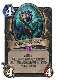3费3/4标准身材,打快攻的时候可以拿来站场,而打控制卡组的时候就可以发挥出它的真正价值了,即配合学术剽窃怒洗20张,或者配合法多雷突袭者强洗6张蛛魔牌,都非常强势,他在这套牌中的定位就是作为添头,不是获胜的主要点,却是可以强化套牌的辅助点。