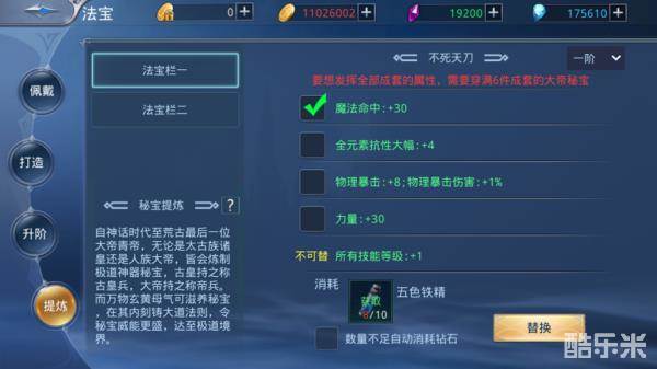 套装属性:在法宝栏中,需要拥有2到6件相同套装属性法宝才能激活套装属性。