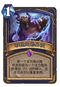 不稳定异变的进化和DK的进化是这套牌最大的亮点,也是最娱乐之处,每次进化那种期待的心情和刺激感,应该是这套牌百玩不腻的原因吧,但如果仅仅只是把随从升级,难免让人觉得有点强行玩以及强度不高的感觉,所以我们一般是选择把残血的随从进化变成更强大的随从,或者是变战吼随从,这个才是最赚的,战吼随从全都亏身材,进化一波几乎都不会亏;最后就是进化图腾了,后期有足够费用情况下,图腾如果出光照元素或者巫师学徒,就可以无限进化至8/8,出末日当我没说。