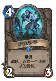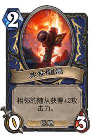 这套牌放弃了二王子,让我们有更高的几率2费有生物下场,更追求前期的稳定性,而2费随从中火舌图腾无疑是很强力的存在,让1费的火羽变成3/2轻松换掉/白吃掉对手生物,还能让对手交解卡,卡对手节奏,但是一般仅限场面先手的情况、或者要利用其buff随从时使用,否则下场就死会很亏。毕竟火舌本身没有自保能力,说到这里还有一种操作就是让火舌躲在嘲讽后面,逼对手交法术,否则别想解。