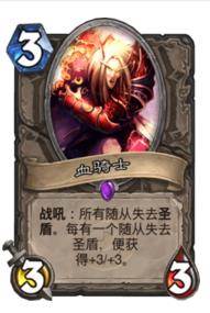 即便环境中很多血骑士,我们依然不怂,为什么?因为一来我们有呱,二来我们有不稳定的异变和DK的进化,即便圣盾被吸,只要随从没死,进化依然可以奏效,只是血骑士压力确实大,最好有呱有进化。而之所以执着于这张卡的原因在于他是目前环境中防御能力最强的单卡,没有之一,并且一张卡三个攻击频率,配合嗜血爆发力也非常强。权衡利弊,选择不怂!