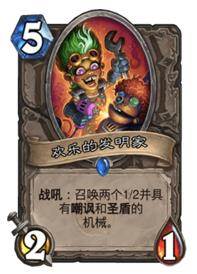 这张卡沉寂了几个版本,在这个版本欢乐发明家的呼唤下终于回归了,欢乐发明家的存在让他入场就可以变成9/9,身材爆炸,不过一般选择吸对手的圣盾,吸自己的时机只有一个,那就是已经10费,且发明家上回合已经上过,这回合费用充足,那么你可以吸自己的圣盾,然后用不稳定异变进化欢乐发明家一家三口;另外打快攻骑士的时候有机会变成15/15甚至更高,锤子有几率加圣盾你懂得。(值得一提,因为血骑士的盛行,快攻们均放弃了银色侍从,避免躺枪)