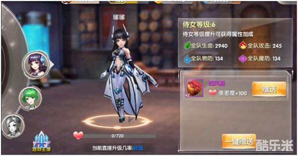 主角达到28级即可开启【送礼】设置,通过送礼增加侍女的亲密度,有点类似与某些游戏中的坐骑升阶的操作,只不过兵界中这个侍女是可以增加全队属性的哦,不同于坐骑只增加主角属性的操作;3个侍女依次开放,想抱得美人归,就得努力送殷勤!3个美女只喜欢酒哦,这些酒除了商店有售,完成相对应得游戏任务也是可以获得滴!