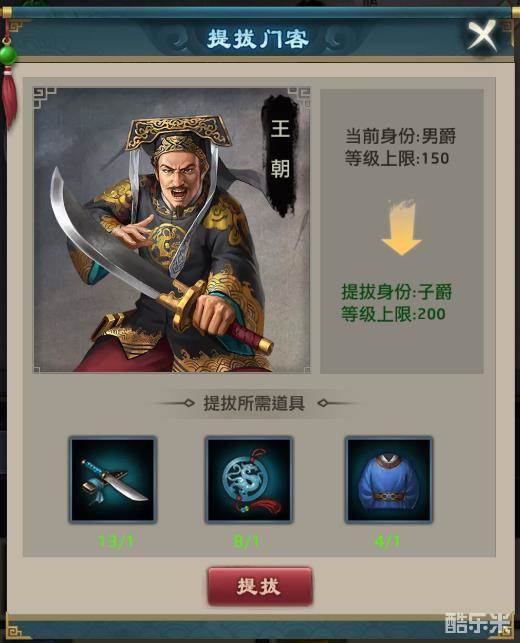当门客提升到一定等级,如100级、150级、200级、250级后,要继续往上提升则需要对门客进行提拔。提拔需要消耗【袍服】【玉佩】【佩刀】各一件。随着门客身份的提升,需要消耗的“爵位三件套”也越来越难获得哦。