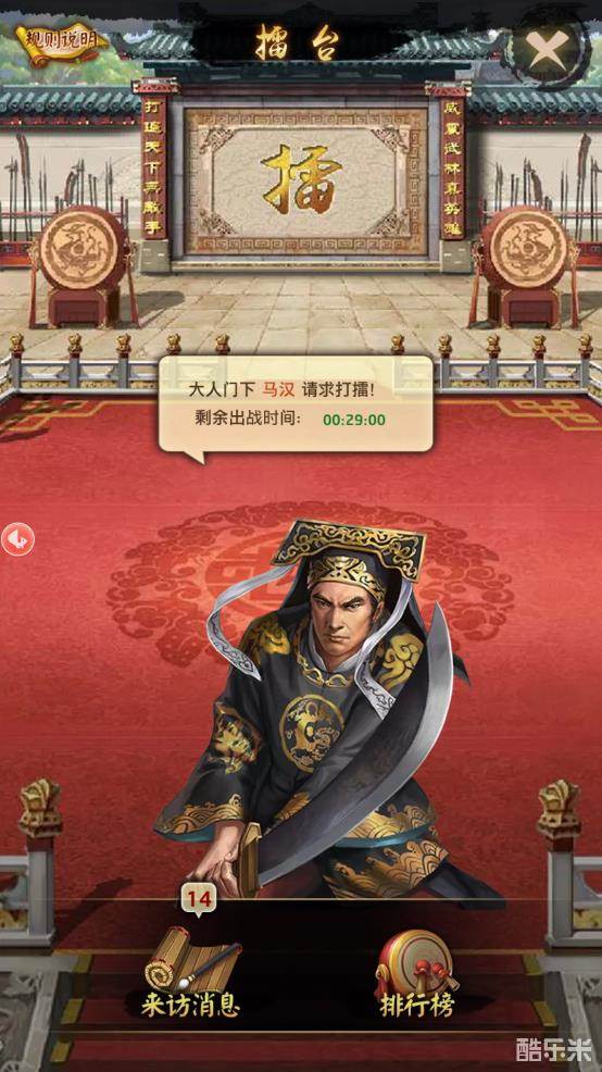 擂台论战,一决雌雄。解锁15名门客,且至少一名门客等级≥60级方可参与擂台论战,每天有4次正常擂台出战次数,每次间隔1小时,每次出使门客随机,按擂台榜单排名匹配相应对手。