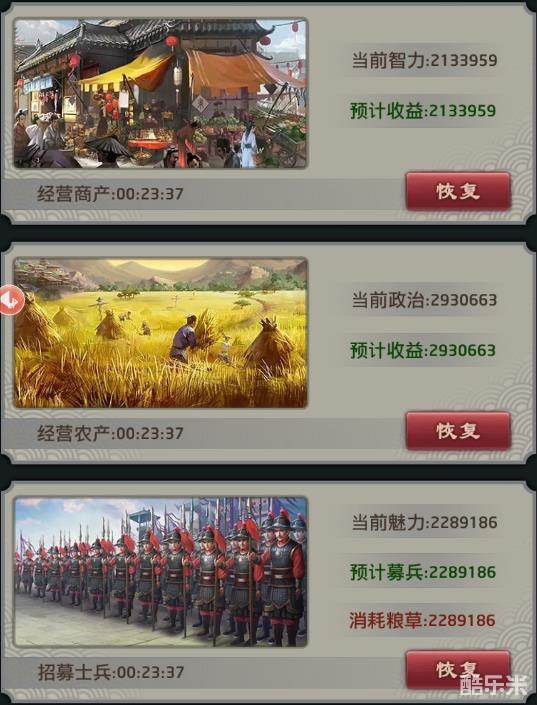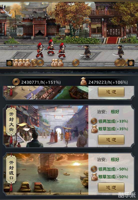 在《麻雀飞青天》中就有一个放置类玩法:巡逻。玩家只需在CD恢复后点击“巡逻”增加挂机收益的百分比,这样即使你的角色离线,界面上的小人仍会不停战斗,你的银两、粮草就会蹭蹭蹭的上涨哦。