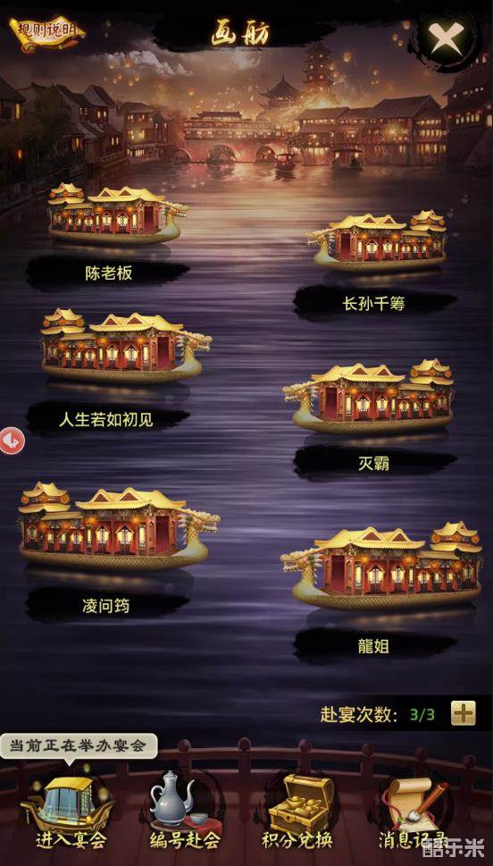 人逢喜事精神爽,无论是金科中举还是缔结良缘,无论是七十大寿还是抱得麟儿,总要来场宴会才能尽兴。点击【画舫】-【进入宴会】,即可开席!