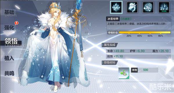 领悟冰雪世界后,上阵的同时可冰冻范围内的单位6秒,领悟极寒之护天赋后使得其每次受到的伤害不会超过33%,在控场的同时也可作为避雷针效果,抵挡高输出单位