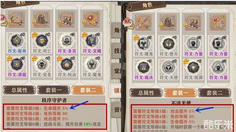 1、前期可用的符文相对较少,等级也比较低。这时候一般就是养一个主力队,高级别的符文优先给主队。划重点:3级符文开始有套装属性,套装属性对于提示战力和实战有很大的好处。前面紫色符文不够3级时,就以黑白为主先搭配出普通的3级套属性。紫色符文有3级的时,开始搭配专属套装。有人说,英雄的专属推荐里没有这个紫色符文怎么办?点开背包内的紫色符文,可以看到这个符文所有的搭配套,你只需找到普通色和这个紫色搭配出的套装就行。然后手动选择符文即可,前期谁先升级出4级免伤套装谁就比较占优势。