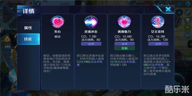 妲己对敌人造成伤害的同时可以减少敌人一定的魔法抗性,可叠加三层。这就使得妲己在进行攻击的同时还能对敌方英雄的法术抗性进行削弱,从而随着等级的成长和输出循环获得更大的伤害收益。