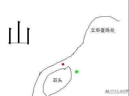 绕石头大家应该听到过很多次,组合起来用有一点小技巧:锁链绊倒是从自己右侧向左侧挥击,所以我们要设法把立华绕进石头与山体之间,让立华从石头靠近他登场方向那侧走出来。出口窄可以挡住他的攻击,石头在玩家左前方刚好可以用出从右侧挥击的绊倒。草图如下: