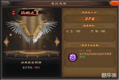 1.3 功能详解:翅膀功能开启后就可以获取第一个翅膀【鲲鹏之翼】每个翅膀都有一个特殊的被动技能,翅膀是游戏中非常核心的一个玩点、翅膀带来酷炫的外观展示和强劲的技能效果和大量的战斗力提升;但也是游戏中获取最为困难的。