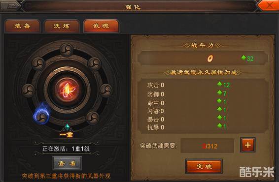 当玩家达到30级时,即可点击主界面的【强化】按钮进入强化界面,点击【武魂】标签页即可打开武魂界面了。拥有足够的武魂值时,即可点击界面中的【突破】按钮进行突破,突破武魂不仅能增加玩家的属性,更能拥有炫酷的武器外观。