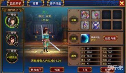 我们可以在“我的弟子”界面里查看到当前弟子的装备、技能以及属性。每位弟子都拥有一个技能,该技能可以进行升级。除了技能,弟子还可以携带装备,我们可以对现有的装备进行分配,提高弟子的战力。