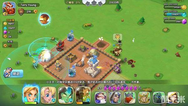 当完成排兵布阵之后,游戏就会进入即时战斗。玩家可以操控英雄和小兵的投放时间和位置。当技能条读满之后,释放屏幕下方的英雄技能来改变战局。