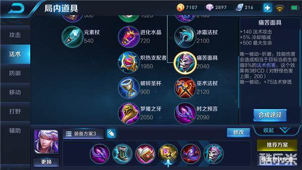 推荐出装:时之预言,抵抗之靴,噬神之书,辉月,博学者之怒,痛苦面具