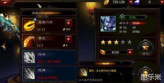 1.龙战八方,连续向前乱舞造成高额伤害,每次施放大招都能增加自己的物攻,这个技能不错随着战斗时间段的延长那么马超的攻击就会随之增加。