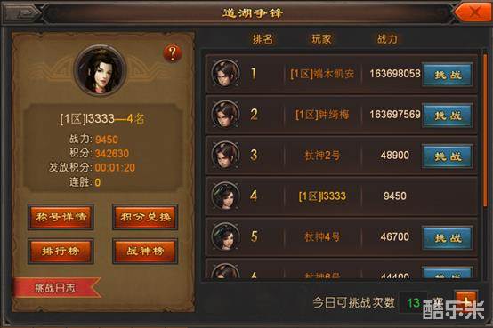 在到湖争锋中,我们可以不断地挑战比自己排名高的玩家,若是挑战获胜即可代替该玩家的排名;并且战斗全程自动进行。所以心有多大胆,就有多大产,只要有实力,你就可以一直往上攀登~