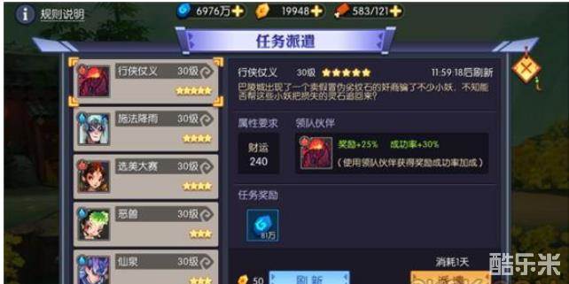 此外,每个任务都有一个领队伙伴,若您的伙伴队伍中正好有这个任务所需的领队伙伴,派出它即可享受任务成功率加成和奖励加成!