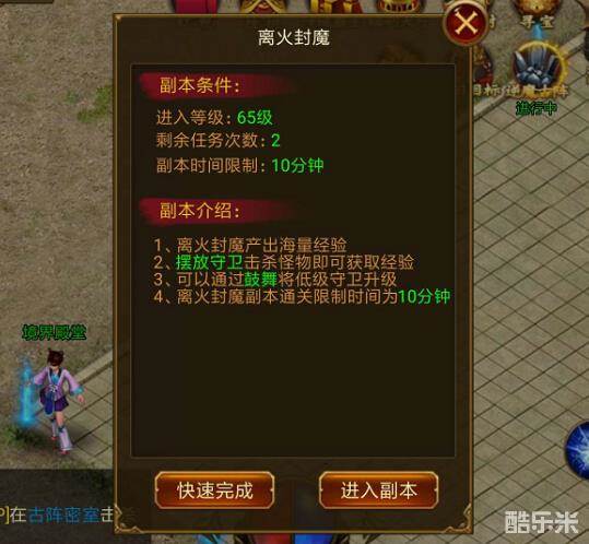 在破天H5里面,想要快速的升级是必不可免的,比如日常的除魔任务就可以让你快速升级,但除魔需要不停的手动操作,有时候还是会消耗你的时间,但是离火封魔则不同,只需要摆放几个守卫,就可以玩类似塔防的副本,而且还可以获得大量的经验,一起来看看吧。