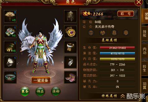 角色系统包括:装备、技能、内功、转生、羽翼5大模块