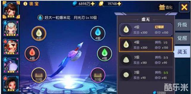 同时,每个槽位都是有脾气的,都需要专属灵玉才能成功镶嵌!当你在造化之门获得灵玉后,可以对其进行合成。同一属性每3个低等级的灵玉可合成1个高一等级的同属性灵玉哦,快去多获得一些灵玉吧!不过,需要注意的一点是,已装备在法宝上的灵玉若想要卸下替换更高等级的,则需要花费少量灵石,所以建议众妖仙们最好一次性获得大量灵玉后再合成镶嵌到法宝中,避免一些不必要的灵石花费。