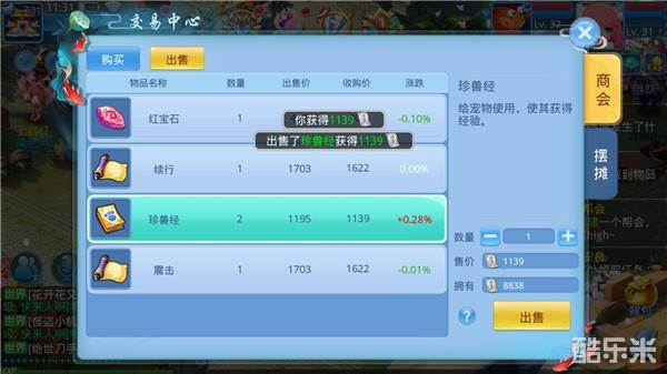 5、交易中心出售道具----平时获得的银票道具出售给系统,获得银票。