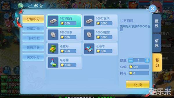 3、积分兑换----不管是分解道具材料、行侠仗义、竞技场、群雄逐鹿、门派任务等活动,都可以获得积分奖励,在人物积分兑换界面可以兑换银两,日积夜累积分是很多的。