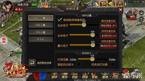 自动喝药可以让我们在PK或者刷怪的时候省去很多麻烦。新的角色自动喝药是默认设置的,后期想要手动调整的话,直接点击红蓝圆球调出菜单,选择“设置”进入“战斗设置”分页进行调整就可以了。