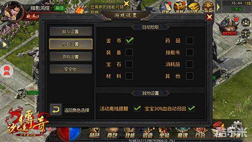 还是在“设置”中,第二个分页就是“拾取设置”,把想要拾取的道具勾选上,我们在刷怪或者活动中就能够自动拾取对应的道具;如果都不勾选,就是不拾取任何道具。