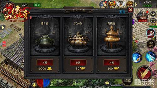 行会上香:行会成员可以通过行会上香来增加行会资金,共有檀木香、沉水香、奇楠香三种。檀木香只消耗金币,沉水香与奇楠香分别消耗不同数额元宝,香的种类不同所增加的行会资金、自身贡献值、经验也有所不同。