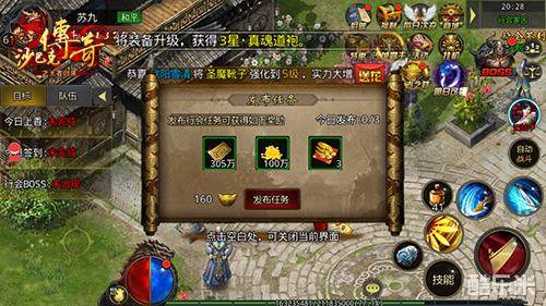 行会任务:会长可使用160元宝发布行会任务,行会中的小伙伴可以通过领取任务并完成获得大量的经验、元宝、行会金锭(为行会增加行会资金,资金用于升级行会等级)。不过行会任务有数量限制,只有5个玩家才可领取,手慢无!