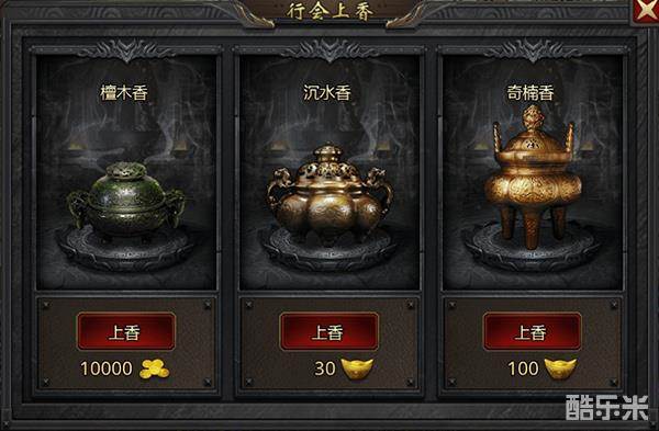 檀木香,消耗一定数量金币,增加行会资金、自身贡献值、经验