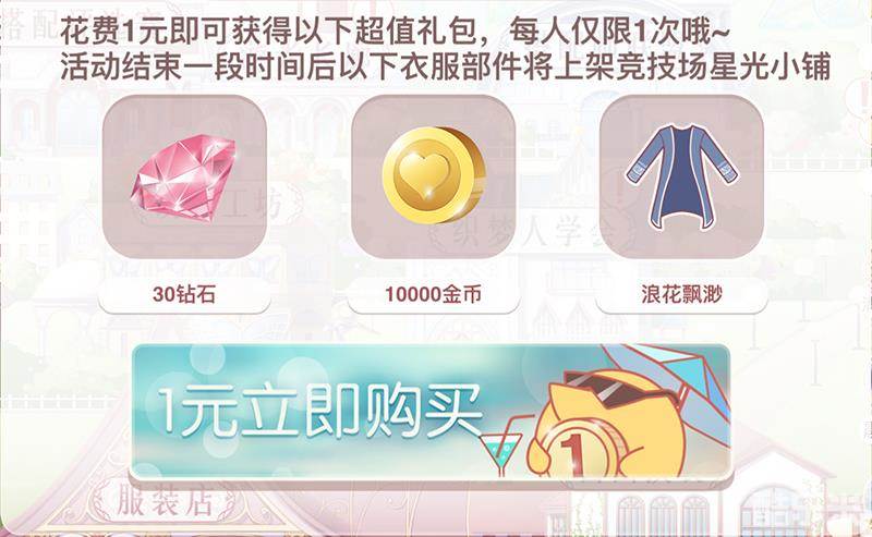 9月7日5:00—9月16日23:59,清凉一元购上架!仅需花费1元即可获得【钻石*30+金币*10000+外套·浪花飘渺】!